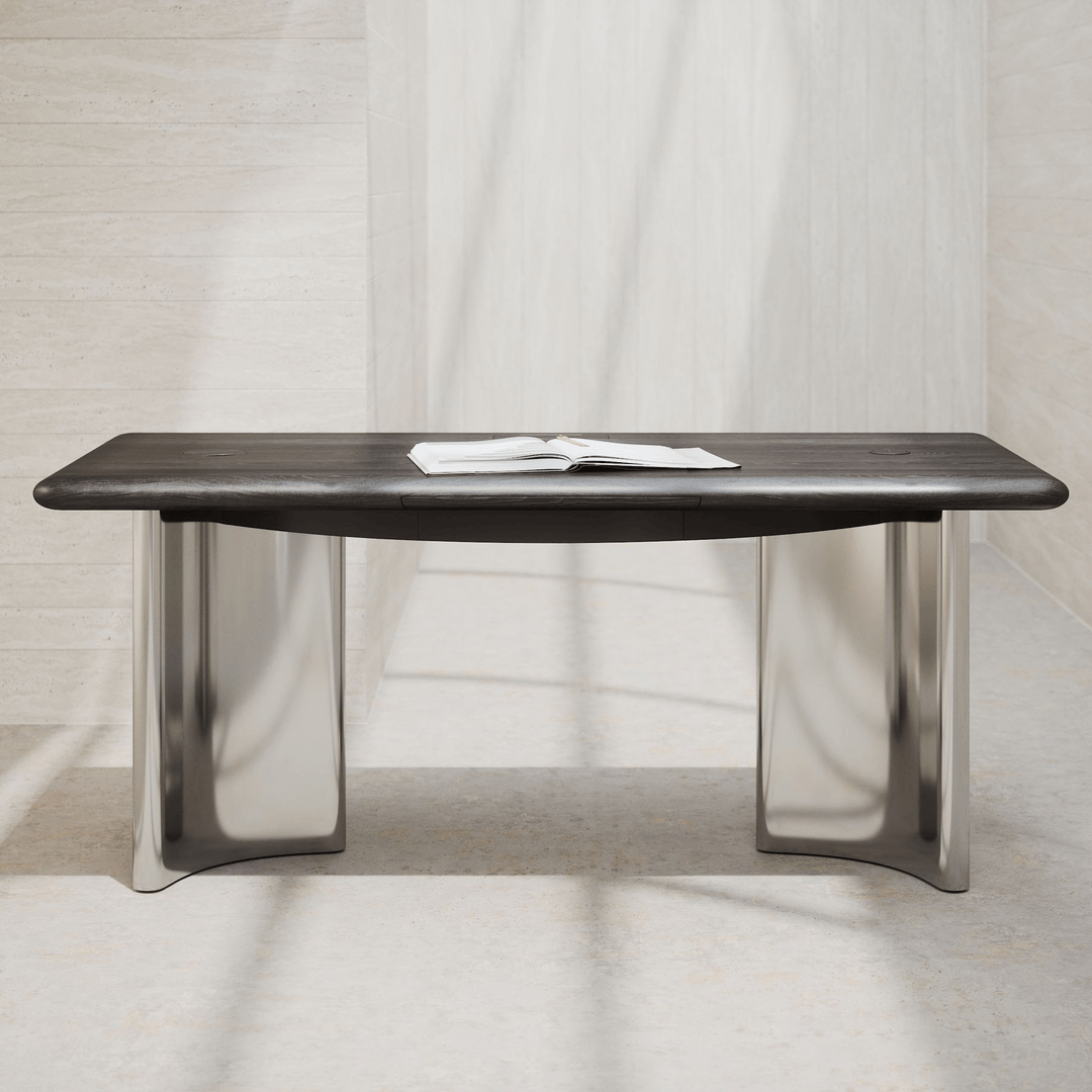 Presenting the JEAN Desk where Smooth lines of sculptural bases in polished stainless steel reflect surroundings creating unique pattern, depend from space where it placed on.