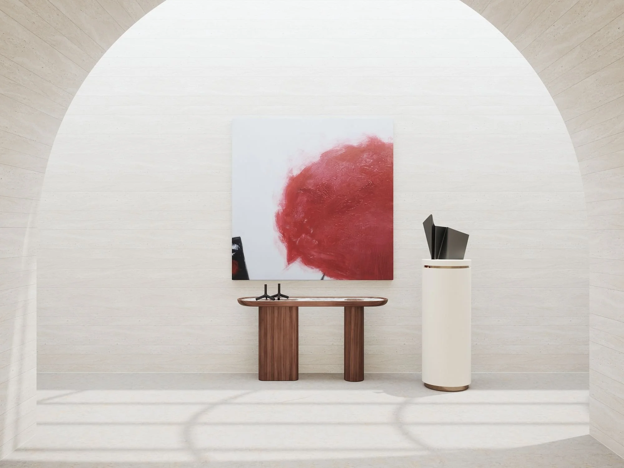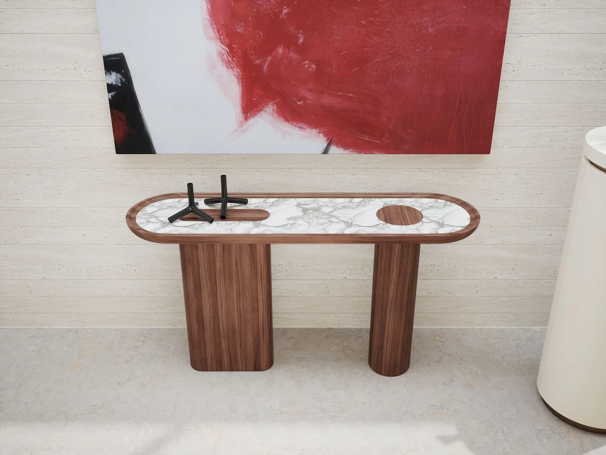The elegance is played on a set of curves that expresses softness and femininity, and a set of materials that allows the work of simple form to give refinement, texture and contrast to the pieces of furniture.
