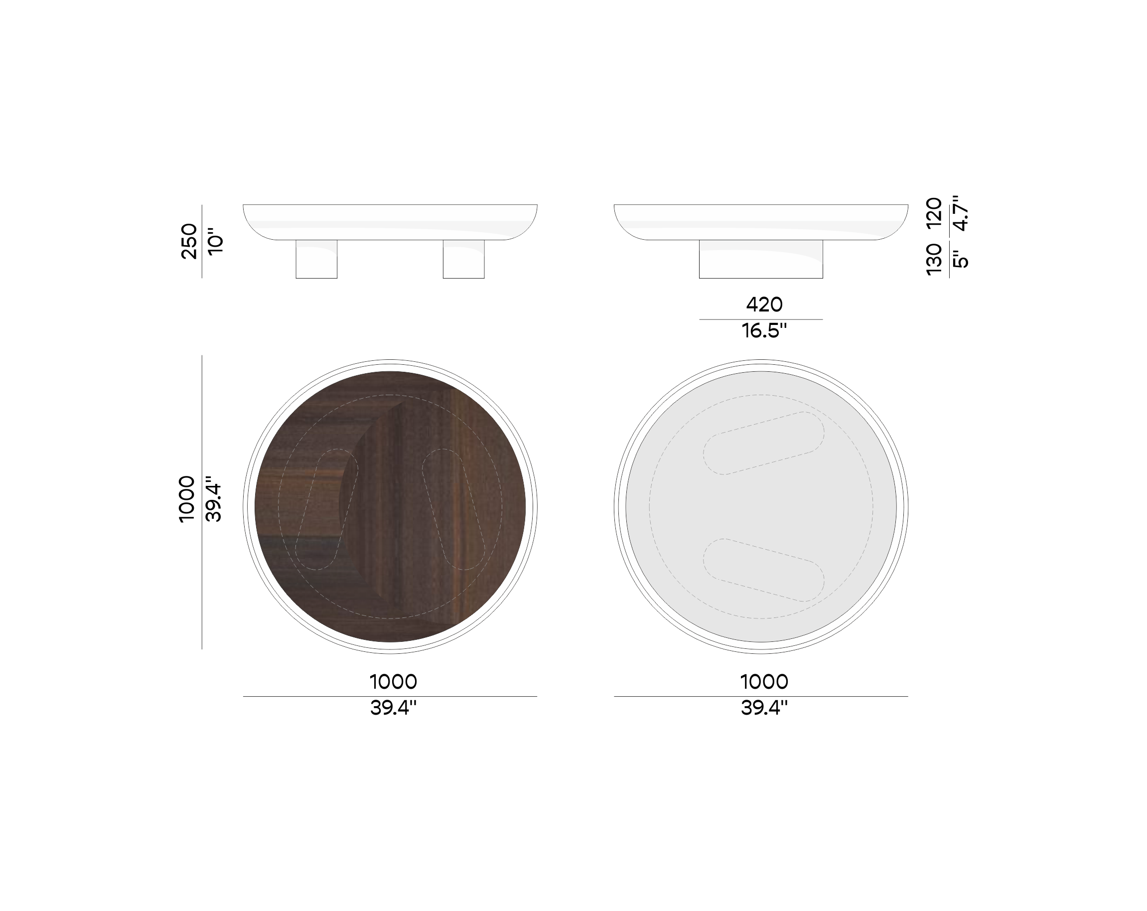 Round coffee table with shaped rounded edges and top insert in natural wood, marble or ceramic. Presented in Black Red Lacquered structure in gloss finish with Calacatta Viola marble top insert.