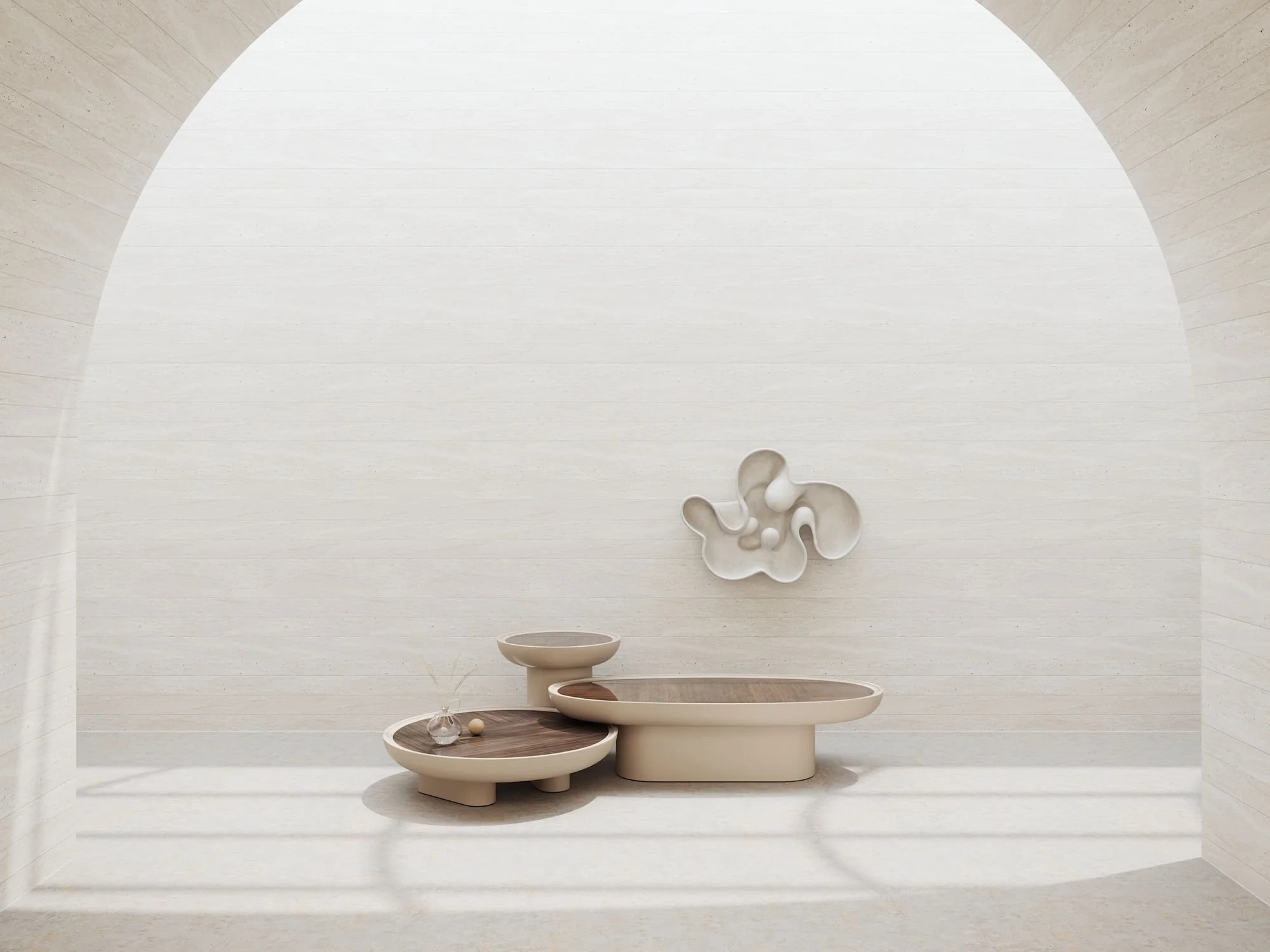Round coffee table with shaped rounded edges and top insert in natural wood, marble or ceramic. Lacquered structure in mat or gloss finish.