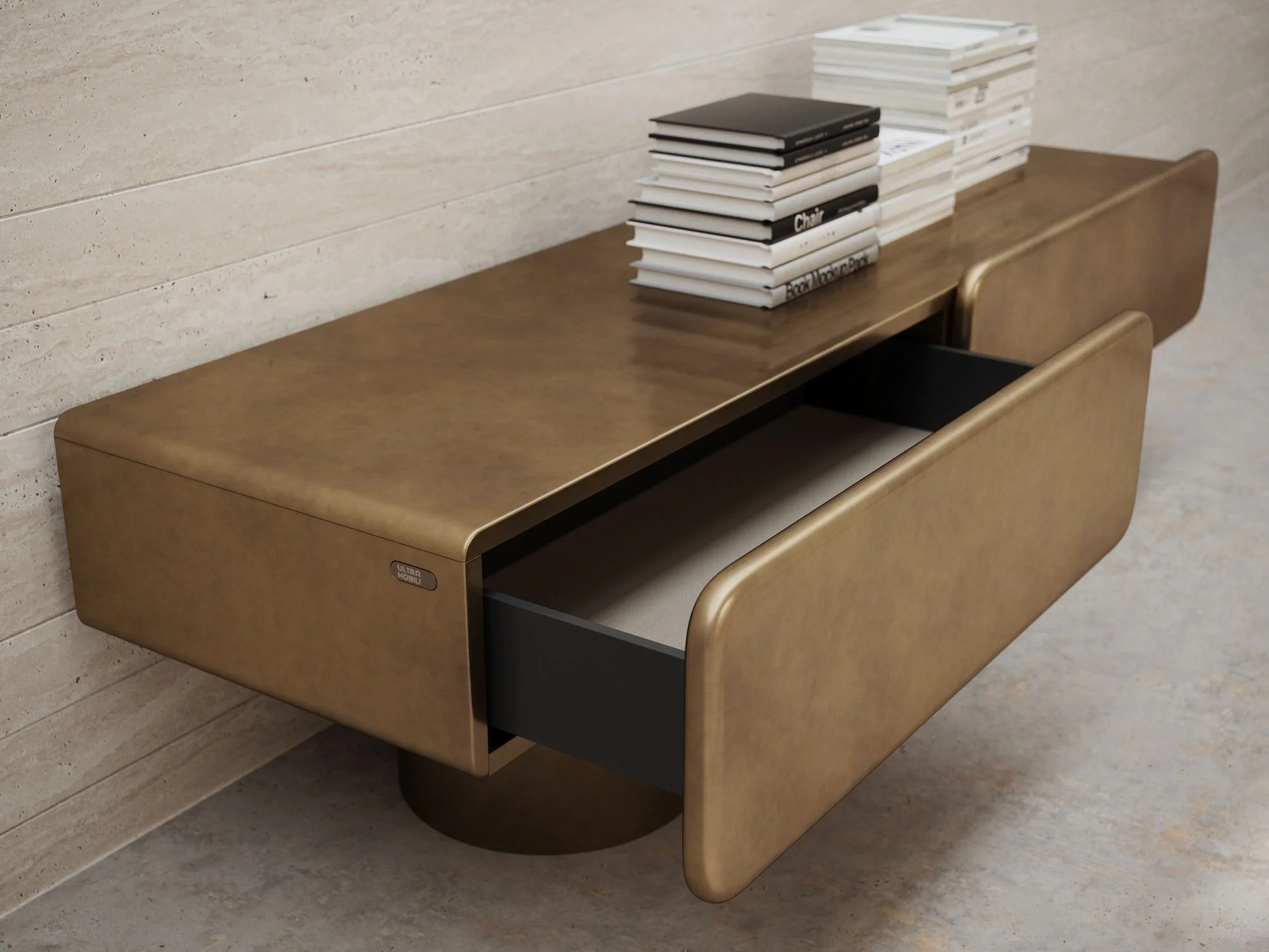 This elegant low sideboard features has two spacious drawers and stylish round legs. Its design includes beautifully rounded fronts and angles, adding a touch of sophistication. The matte bronze metal effect lacquered finish on MDF provides a smooth and modern look. It stands on a sturdy metal cylinder base, enhancing its contemporary appeal.