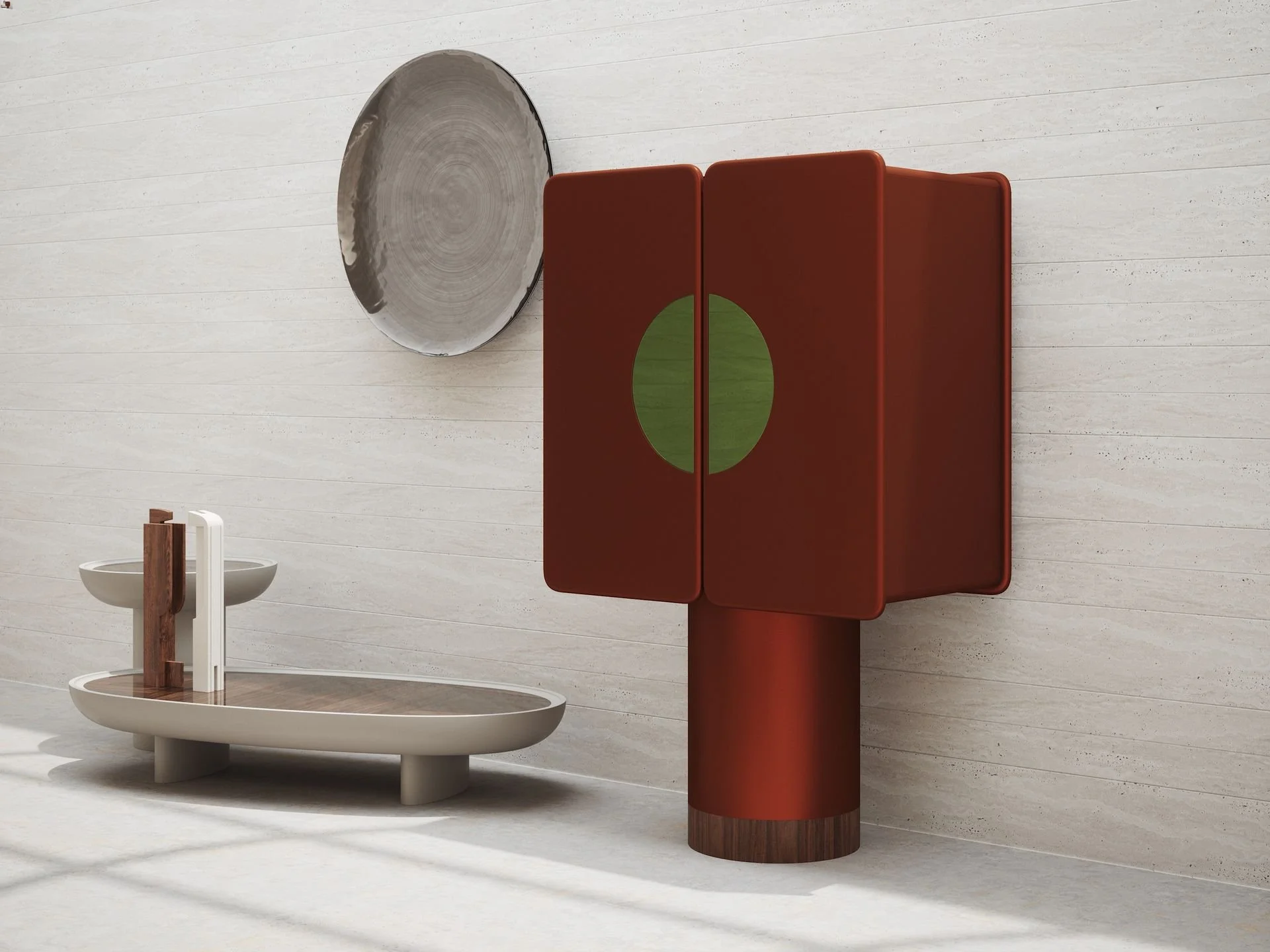 REGIS Bar Cabinet in semi-glossy metalized Pearl Copper lacquer and dichroic mirror inserts on the doors.