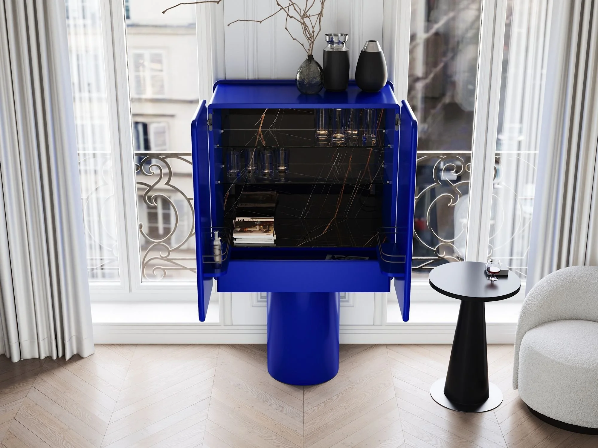 internal Sahara Noir is a perfect background for bar cabinet content.